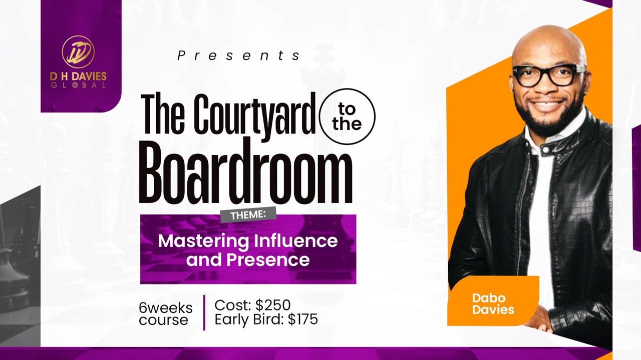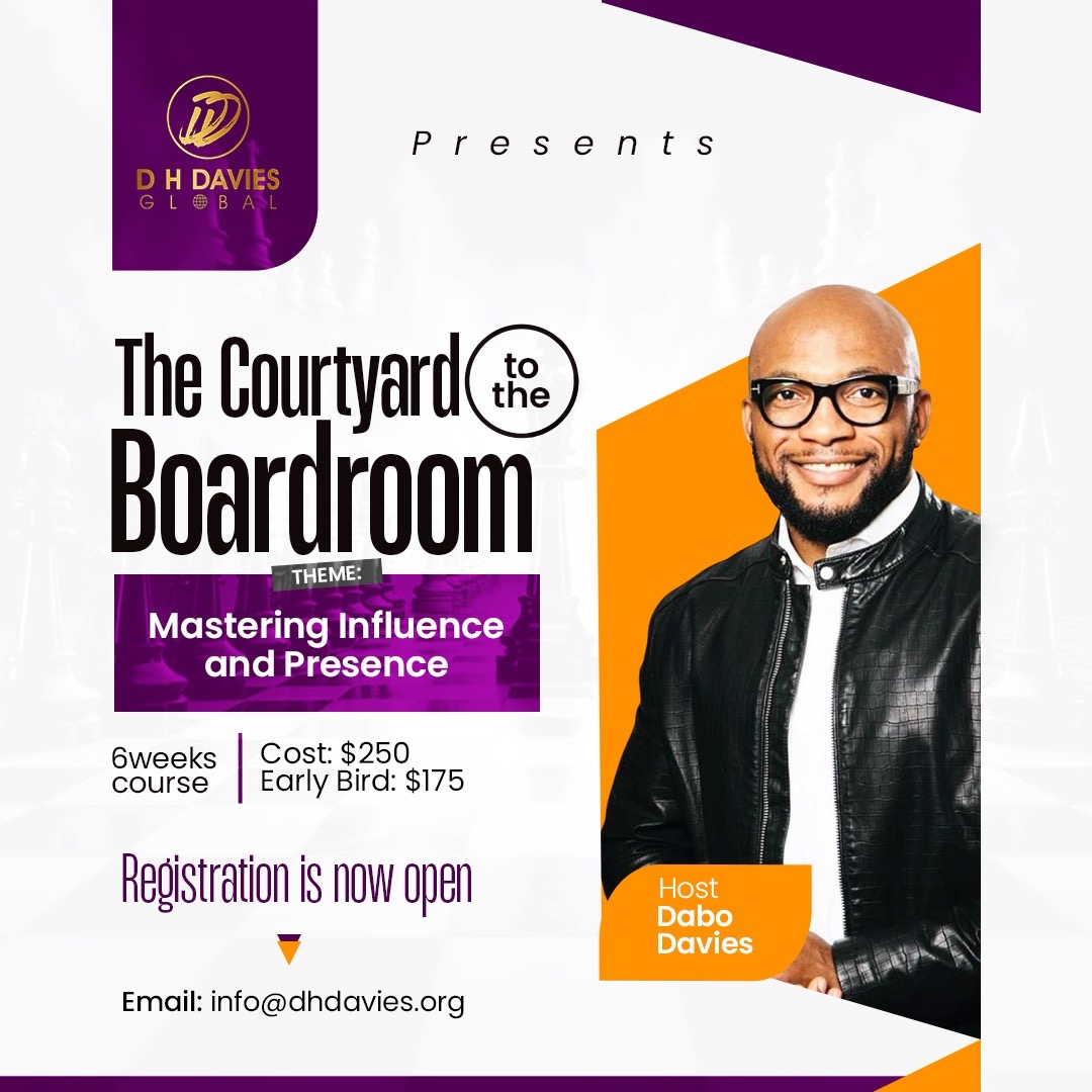 Dabo Davies is Principal Consultant van DH Davies Global, Inc., een toonaangevend wereldwijd leiderschapsadviesbureau met als missie een omgeving te creëren waarin zowel succesvolle zakenmensen als startups, impactvolle leiders en aspirant-leiders alle beschikbare middelen kunnen benutten voor exponentiële groei, hoge productiviteit en wereldwijde invloed in een onvoorspelbaar klimaat.